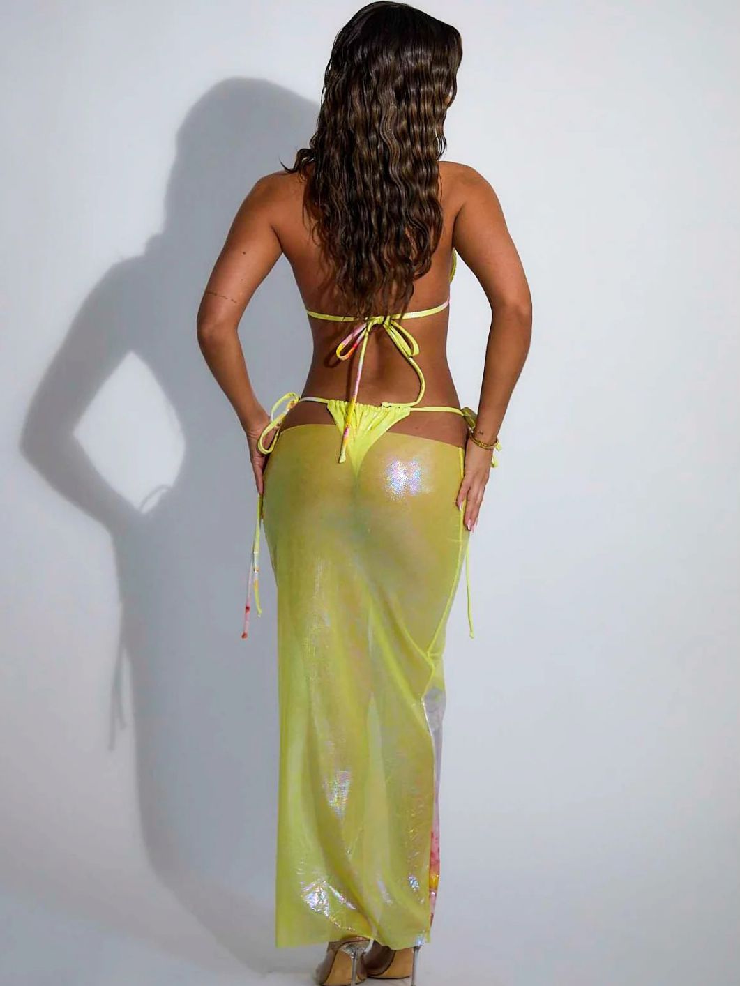 ZASUWA Female Unique Glossy Mesh Flower Print with Metal Ring 3-Pieces Bikini Set